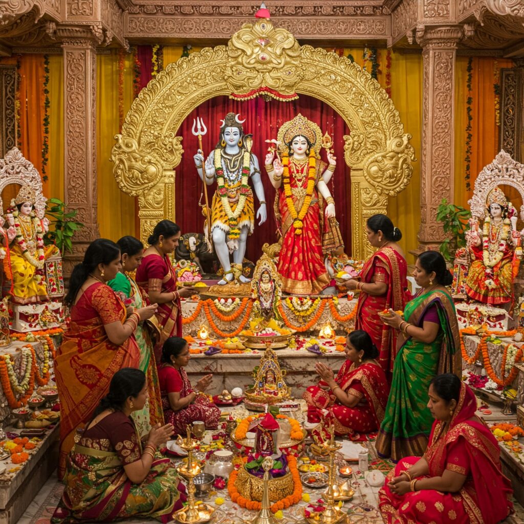 महिलाएं सुबह जल्दी उठती हैं, स्नान कर एक विशेष धार्मिक अनुष्ठान करती हैं, और पारंपरिक परिधान धारण करती हैं, जो अक्सर लाल, हरे और पीले जैसे चमकीले रंगों में होते हैं, जो समृद्धि और वैवाहिक सुख का प्रतीक माने जाते हैं। एक प्रमुख अनुष्ठान में रेत या मिट्टी से भगवान शिव, देवी पार्वती और भगवान गणेश की मूर्तियों का निर्माण किया जाता है।